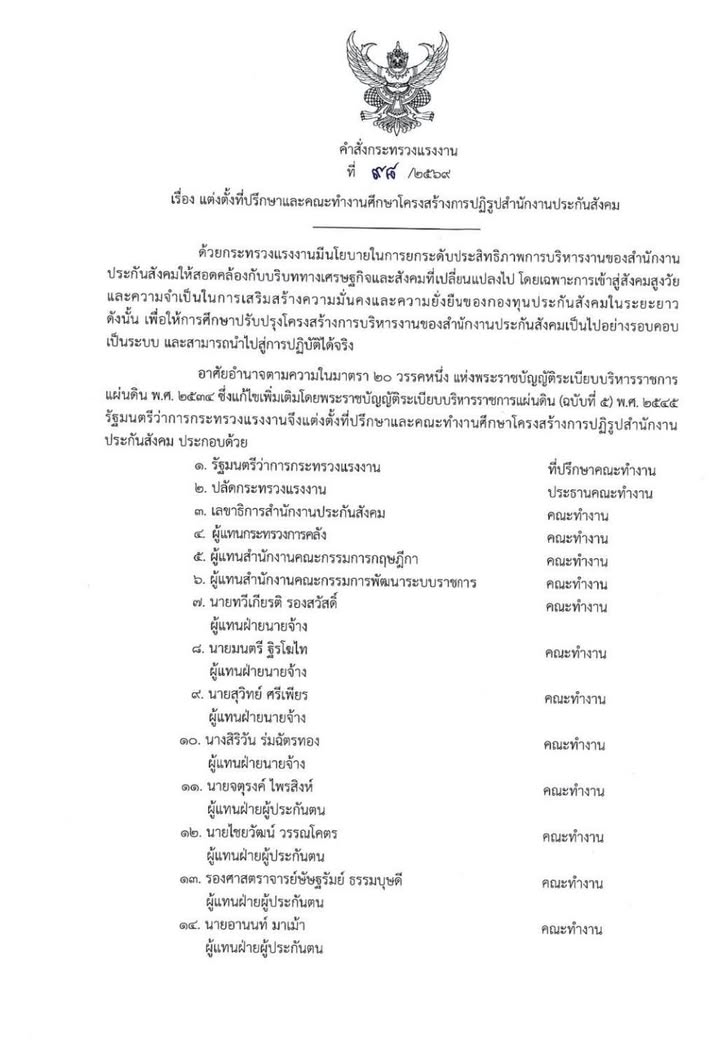 สวนข่าวประจำวันศุกร์ที่ ๓๐ ม.ค. ๒๕๖๙ ขึ้น ๑๒ ค่ำ เดือน ๓ ปีมะเส็ง…ตรีนุช เทียนทอง แคนดิเดตนายกรัฐมนตรี พรรคพลังประชารัฐ ในฐานะ รมว.แรงงาน ลงนามคำสั่งกระทรวงแรงงานที่ ๙๘/๒๕๖๙ ลงวันที่ ๒๙ ม.ค. ๒๕๖๙ ตั้งคณะทำงานปฏิรูปประกันสังคม ๑๕ คน มีปลัดกระทรวงแรงงาน เป็นประธาน มีตัวแทนฝ่ายนายจ้าง ๔ คน แต่มีฝ่ายลูกจ้างแค่ ๓ คน กำหนดหน้าที่รับผิดชอบดำเนินการจัดทำแผนปฏิรูปประกันสังคม-กำกับติดตามประเมินความก้าวหน้าของการดำเนินงานตามแผน-พิจารณาคัดเลือกและเสนอรายชื่อผู้มีความรู้ความเชี่ยวชาญและประสบการณ์จากสถาบันการศึกษาร่วมศึกษาวิเคราะห์และให้ข้อเสนอแนะ-แต่งตั้งผู้เชี่ยวชาญที่มีความรู้ ความเชี่ยวชาญและประสบการณ์ด้านต่างๆมาเป็นที่ปรึกษาตามความเหมาะสม…ทั้งหมดนี้กำหนดให้ต้องดำเนินการแล้วเสร็จในเวลา ๖๐ วันนับจากวันนัดประชุมคณะทำงานครั้งแรกเป็นต้นไป…@@