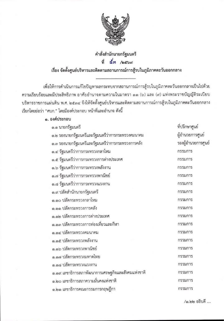 สงครามตะวันออกกลางลากยาวครบ ๑ สัปดาห์…นรม.อนุทิน ชาญวีรกูล ได้ฤกษ์ลงนามรวดเดียว ๒ ฉบับ รับมือสถานการณ์ ๑).คำสั่งนายกรัฐมนตรีที่ ๒/๒๕๖๙ เรื่องกำหนดมาตรการเพื่อแก้ไขและป้องกันภาวะขาดแคลนน้ำมันเชื้อเพลิง มีสาระสำคัญคือห้างส่งออกผลิตภัณฑ์น้ำมันและก๊าซธรรมชาติเหลวไปขายลาวและเมียนมา ๒).คำสั่งสำนักนายกรัฐมนตรีที่ ๕๓/๒๕๖๙ เรื่องตั้งศูนย์บริหารและติดตามสถานการณ์สู้รบในตะวันออกกลาง (ศบก.) ประกอบด้วยคณะกรรมการ ๓๗ คน มีนายกรัฐมนตรีเป็นประธาน-รองนรม.และรมว.พิพัฒน์ รัชกิจประการ เป็น ผอ.ศบก. มีรมว. ๗ กระทรวง-ปลัดและเลขาธิการหน่วยราชการ ๑๓ คน-อธิบดี-ผู้แทนองค์กรภาคเอกชน-ซีอีโอ ปตท. และ ผู้ว่าการแบงก์ชาติ ร่วมเป็นคณะกรรมการ…ในจำนวนนี้ไม่มีรมว.เกษตรฯ-ปลัดกระทรวงเกษตรฯ และอธิบดีสังกัดกระทรวงเกษตร @@